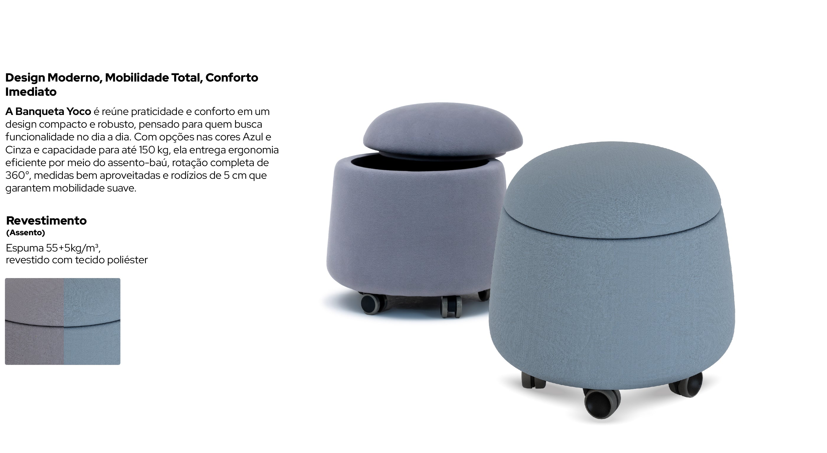 Disponível nas cores Azul e Cinza, a Yoco combina estilo com resistência, suportando até 150 kg e oferecendo uma experiência ergonômica acessível e confiável.
