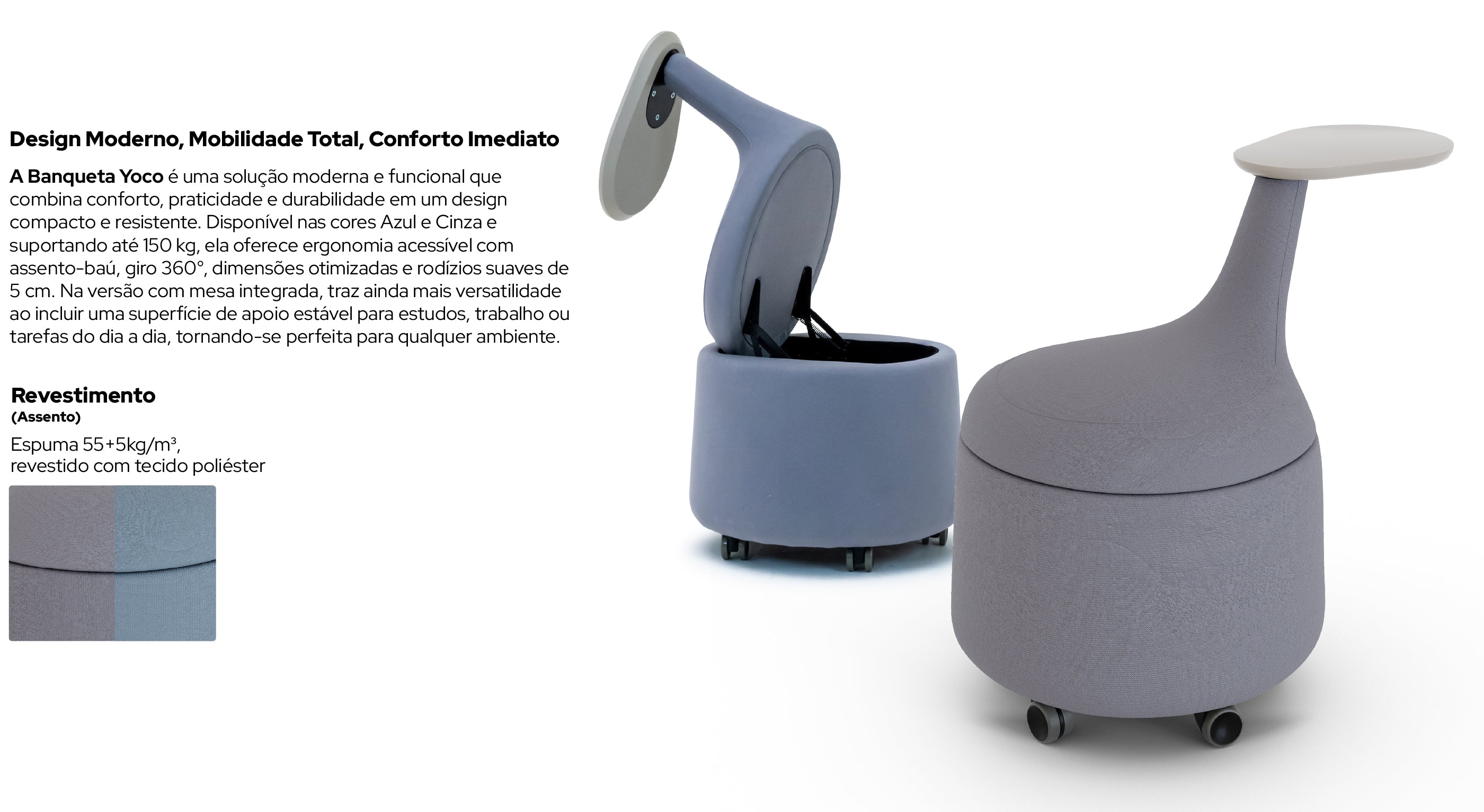 Disponível nas cores Azul e Cinza, a Yoco combina estilo com resistência, suportando até 150 kg e oferecendo uma experiência ergonômica acessível e confiável.