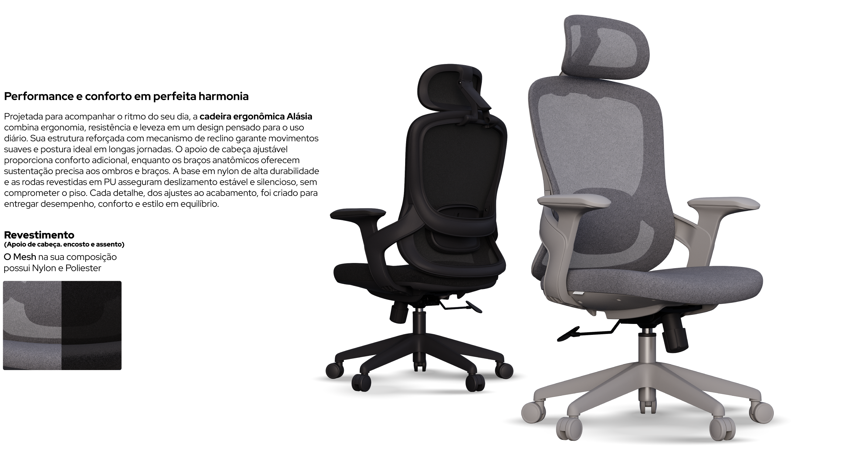 Conforto Imbatível : O assento com espuma de 58kg/m³ garante o conforto ideal para longas horas de uso. O encosto em malha (nylon e poliéster) oferece respirabilidade, mantendo a cadeira fresca durante o uso prolongado.