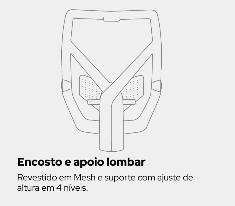 Encosto com Tecnologia Mesh Respirável: Mantenha-se fresco e concentrado. O encosto em Malha (Nylon e Poliéster) oferece a ventilação constante nas suas costas, que previne o acúmulo de calor e suor.