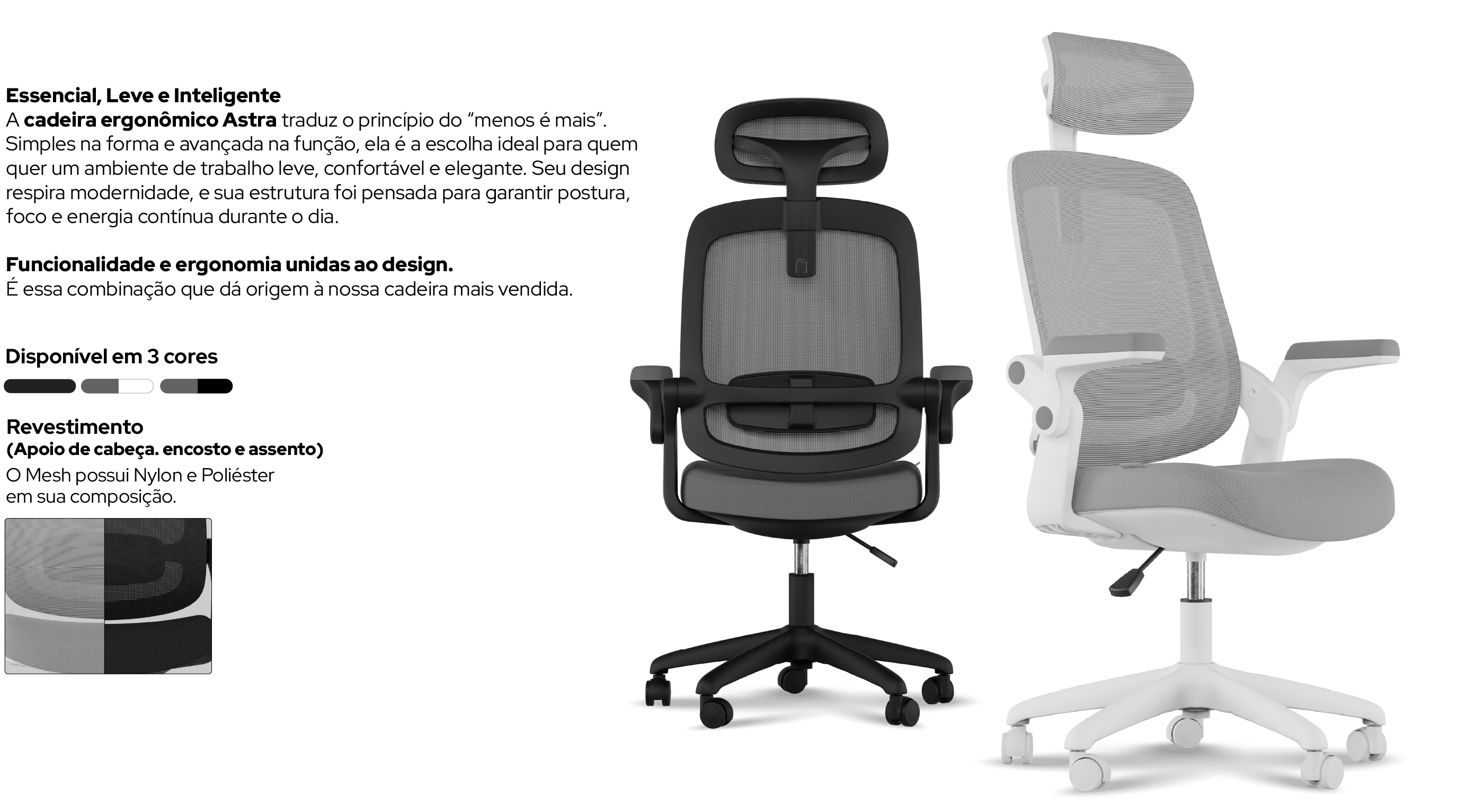A Cadeira de Escritório Astra oferece um novo nível de suporte e ergonomia para longas jornadas de uso. Seu design transmite leveza e complementa qualquer ambiente de trabalho. O modelo Astra foi projetado com ergonomia de nível profissional, utilizando materiais premium, mais complexos e sofisticados do que nunca.