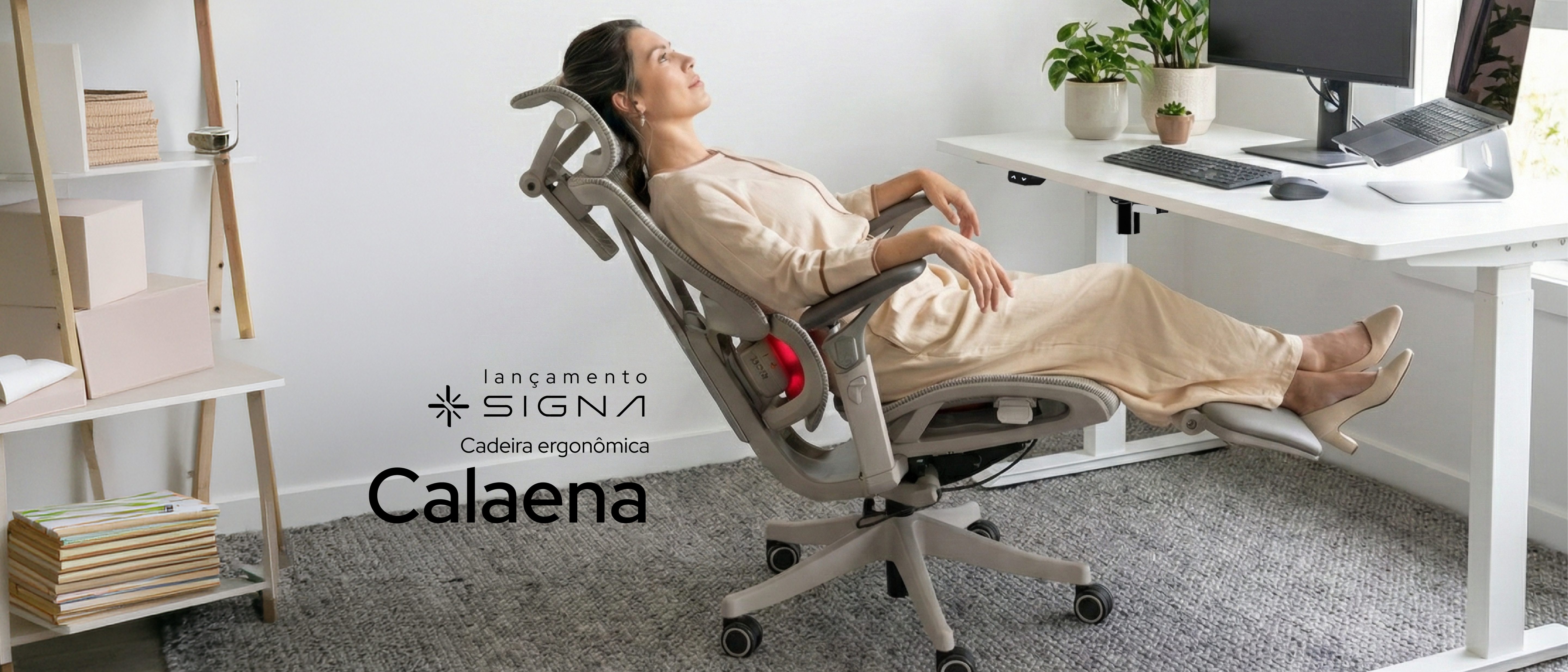 A Cadeira Calaena suporta 136 kg e segue a NR 17, trazendo massagem lombar 2+2 e braços 6D 360° para máximo conforto e ajuste no seu home office.Produtividade, Investimento, Imagem profissional