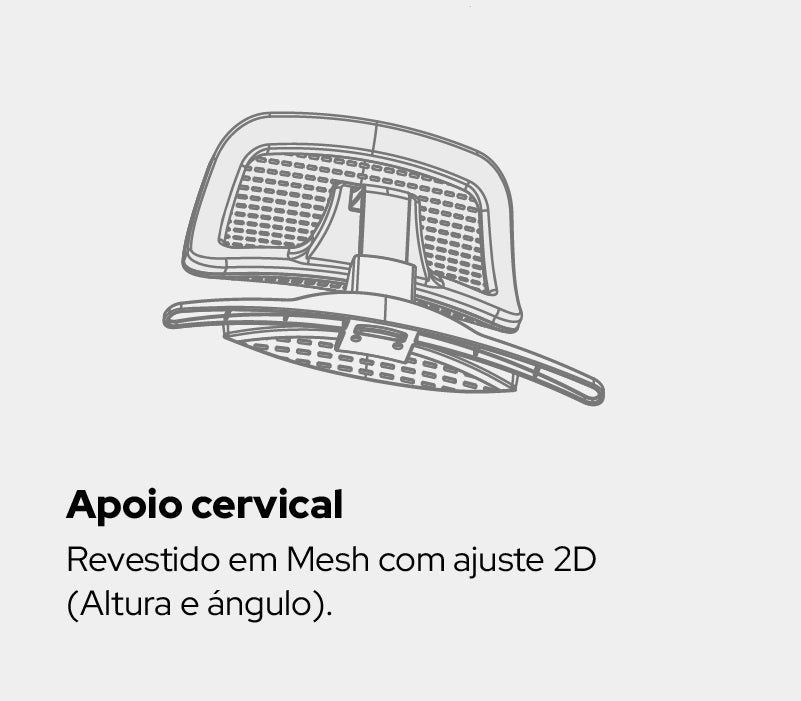 Suporte cervical: apoio de cabeça em mesh com ajuste de altura e ângulo para alívio da tensão.