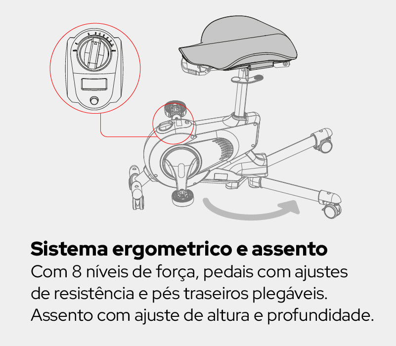 Ergonomia ativa: sistema de pedais integrados com ajuste de resistência para exercitar as pernas durante o uso.