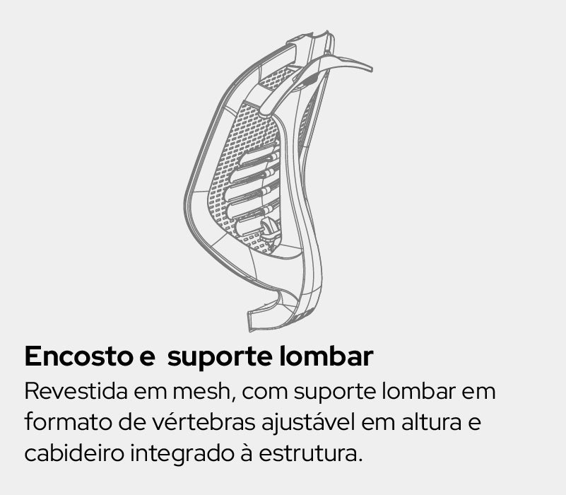 Encosto: Mesh, nylon e poliéster com ajuste de tensão