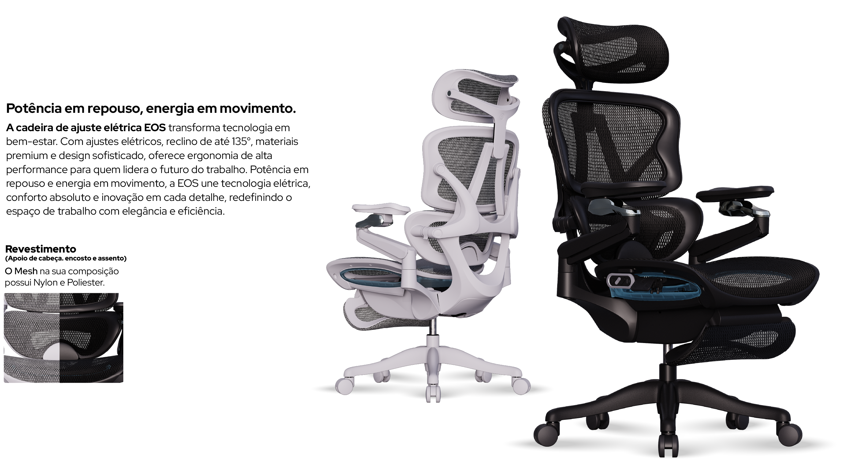 Apresentamos o lançamento que define um novo padrão de conforto e tecnologia: a Cadeira de Escritório Eos. Projetada para o profissional de elite, a Eos transforma seu ambiente de trabalho em um centro de ergonomia e relaxamento, sendo a escolha definitiva para quem exige o máximo.