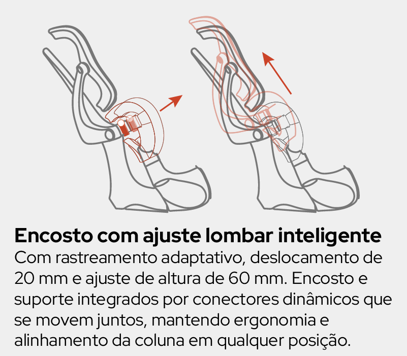Apoio Lombar Avançado: Ajuste a região lombar em profundidade e direção, personalizando o suporte para a sua coluna.