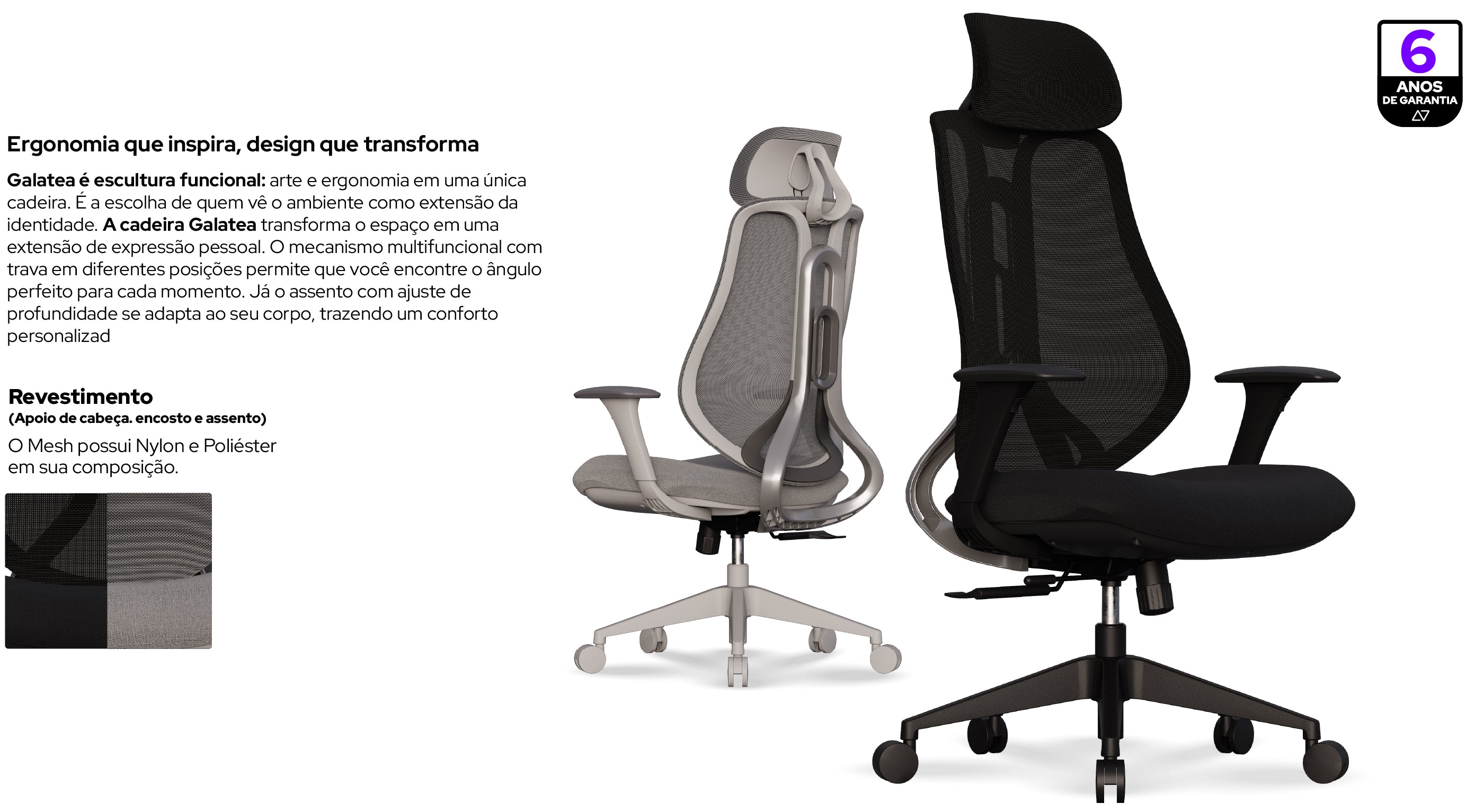 A cadeira ergonômica Galatea possui certificação BIFMA e atende aos requisitos da NR-17. Essas certificações asseguram que a cadeira foi projetada para proporcionar suporte adequado, prevenindo desconfortos e lesões relacionadas à postura inadequada.