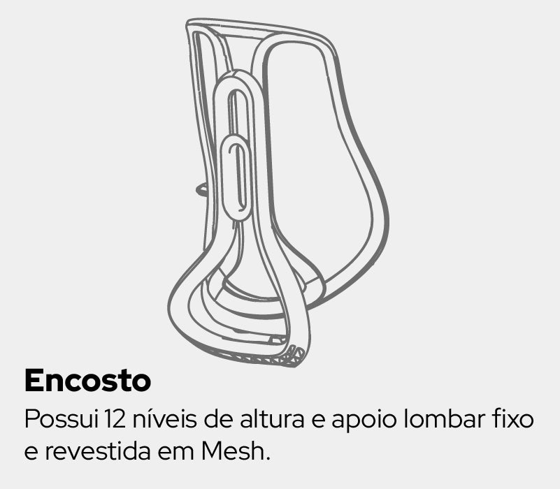 Lombar Sustentada: O design do encosto e a tensão do mesh oferecem suporte eficaz à região lombar, garantindo uma postura saudável mesmo durante longas horas de uso.