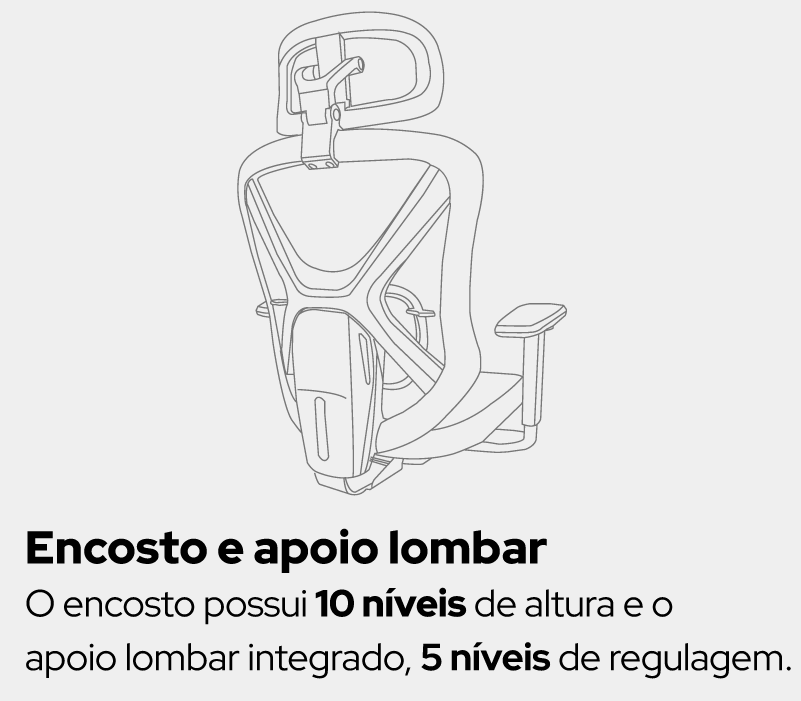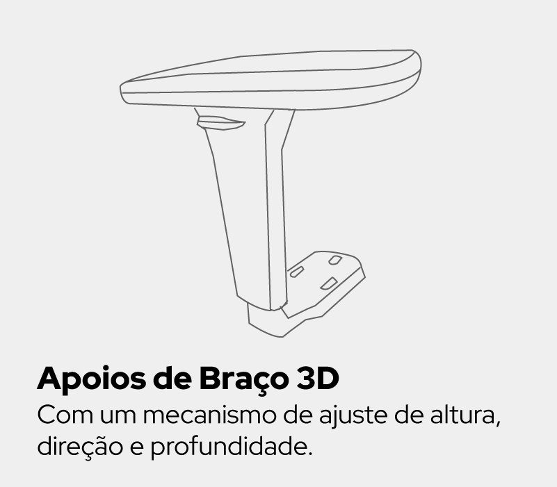 Braços (Diferencial): Diferente de modelos básicos, os braços são totalmente ajustáveis em , garantindo o encaixe perfeito com a sua mesa e prevenindo dores nos ombros e pescoço.