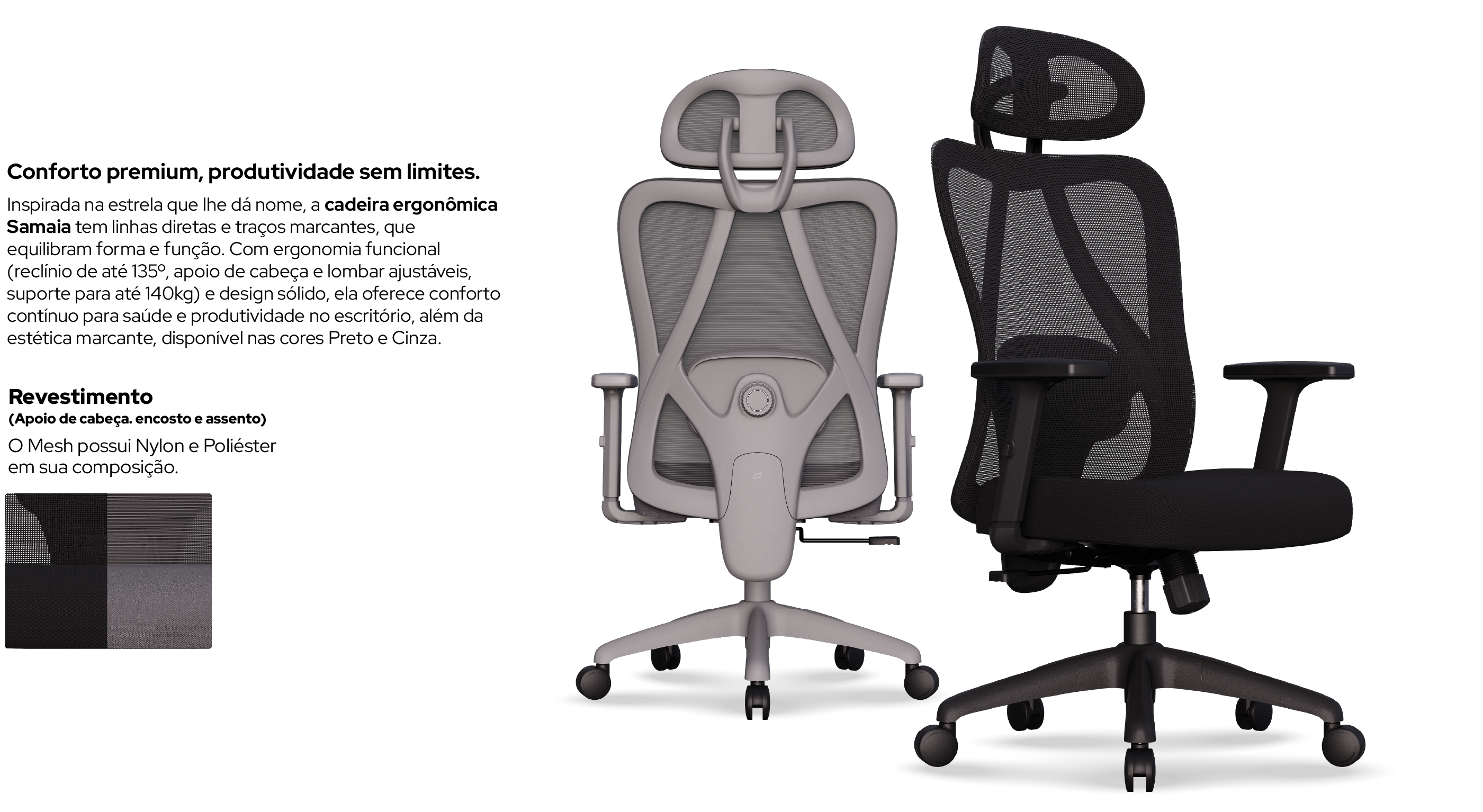 Com elegância nas cores Preto e Cinza (as preferidas do mercado) e suporte para até , a Samaia é a sua nova cadeira de escritório giratória definitiva.