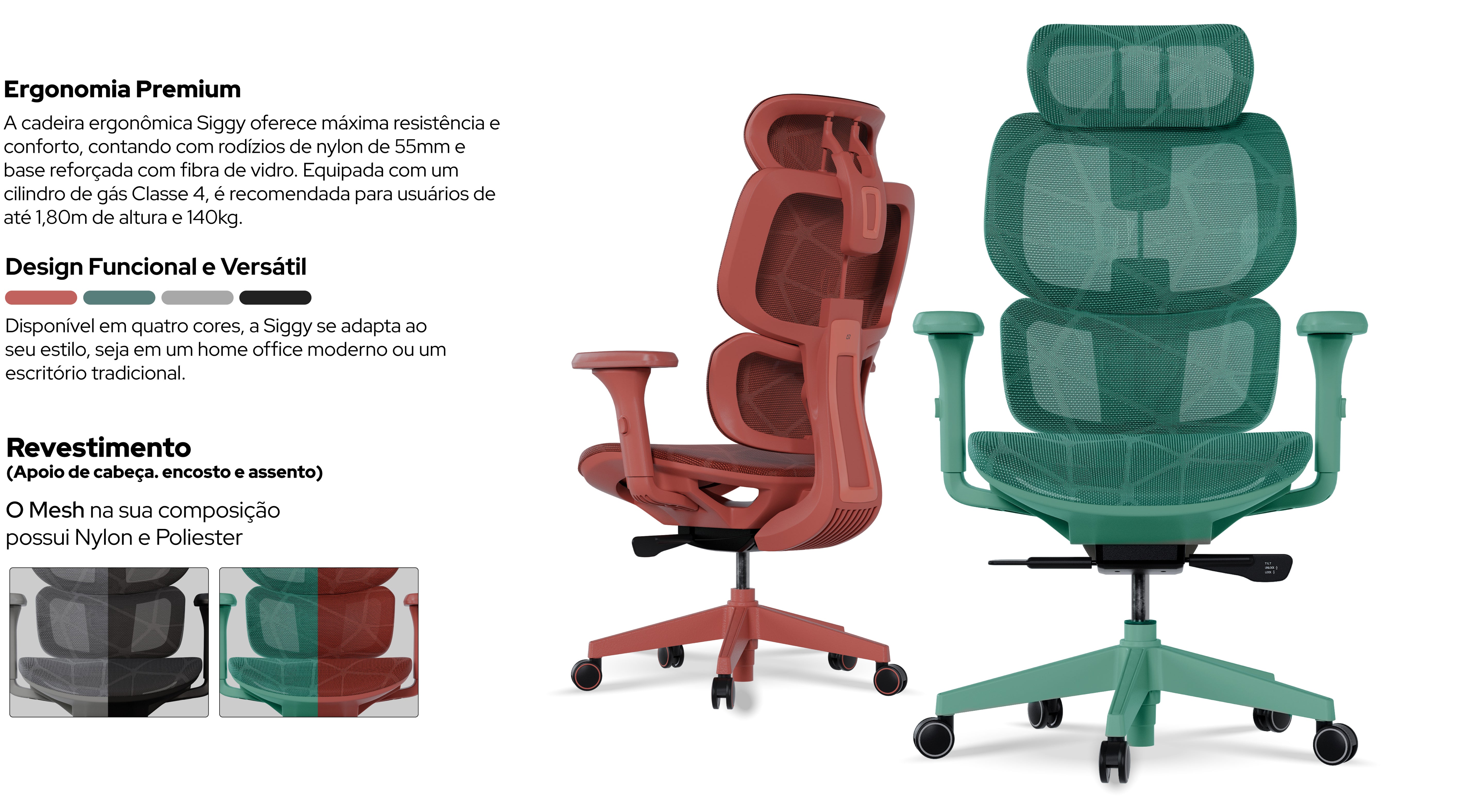 Experimente a combinação perfeita de design, ergonomia e praticidade com a Cadeira Ergonômica Siggy. Projetada em conformidade com a NR-17, ela oferece conforto e funcionalidade em todos os detalhes. Com mesh 100% poliéster respirável, apoio de cabeça e lombar ajustáveis, e suporte total às costas, a Siggy promove uma postura saudável e aumenta sua produtividade em longas jornadas de trabalho. Ideal para profissionais criativos e técnicos que valorizam estética e eficiência.