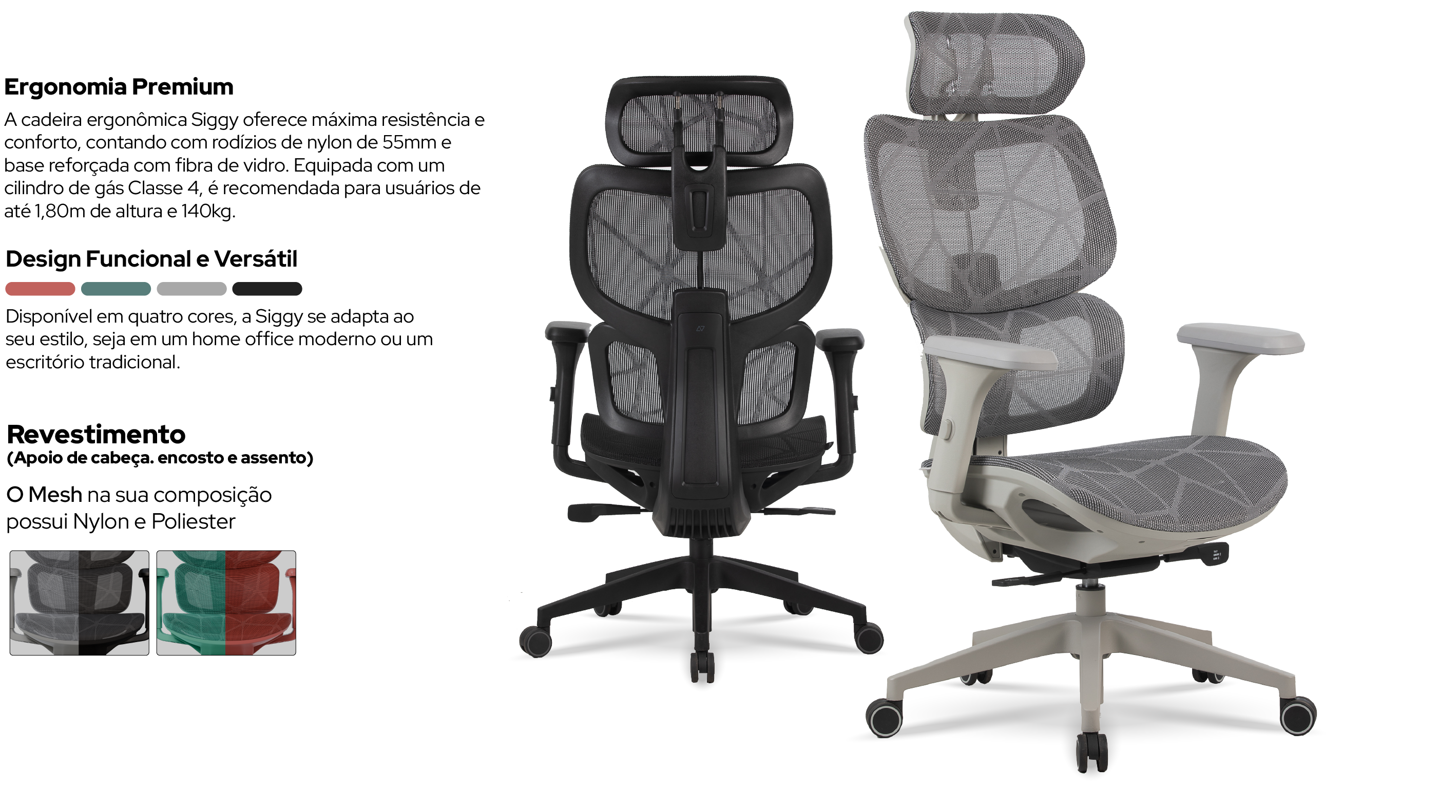 A cadeira ergonômica Siggy possui certificação BIFMA e atende aos requisitos da NR-17. Essas certificações asseguram que a cadeira foi projetada para proporcionar suporte adequado, prevenindo desconfortos e lesões relacionadas à postura inadequada.