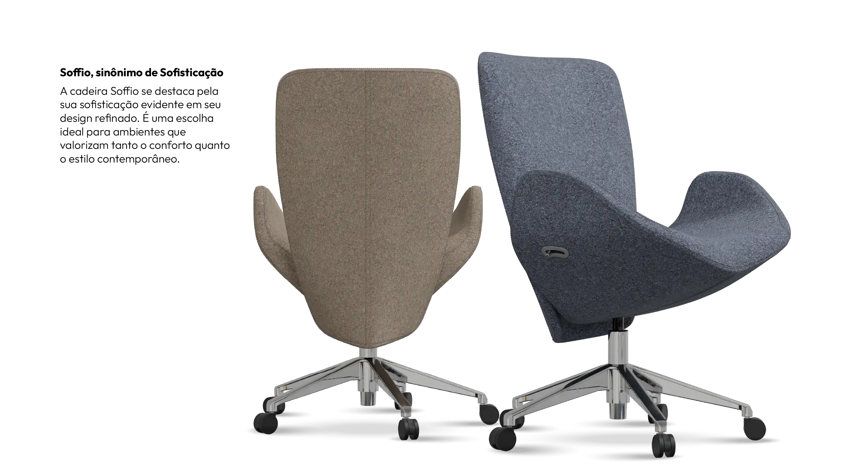 A cadeira Soffio combina ergonomia, conforto e elegância, sendo a escolha perfeita para espaços de trabalho que exigem durabilidade e design premium.