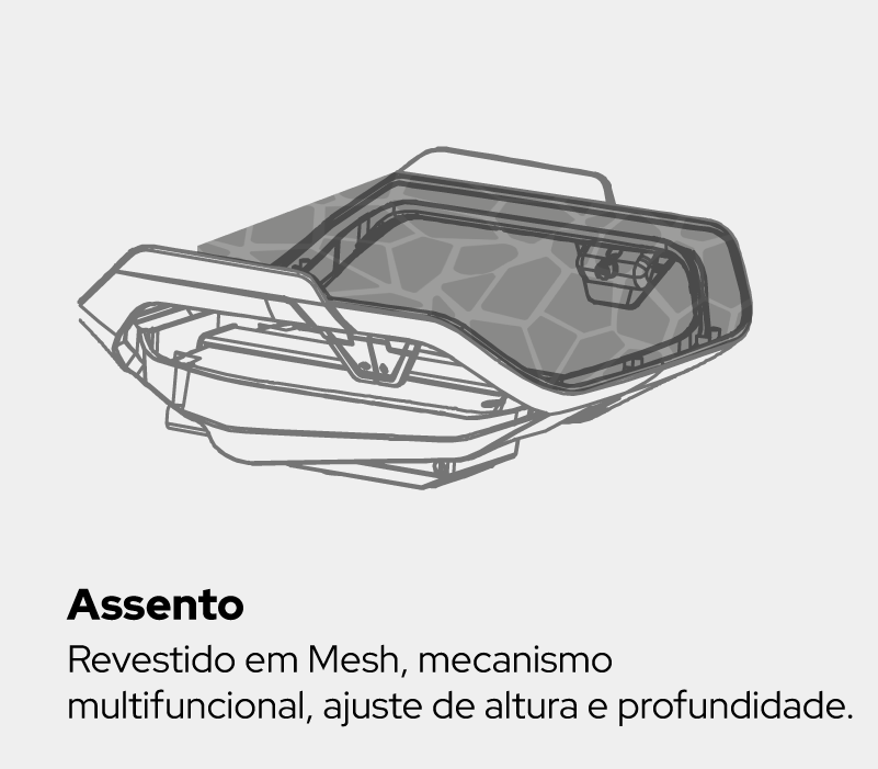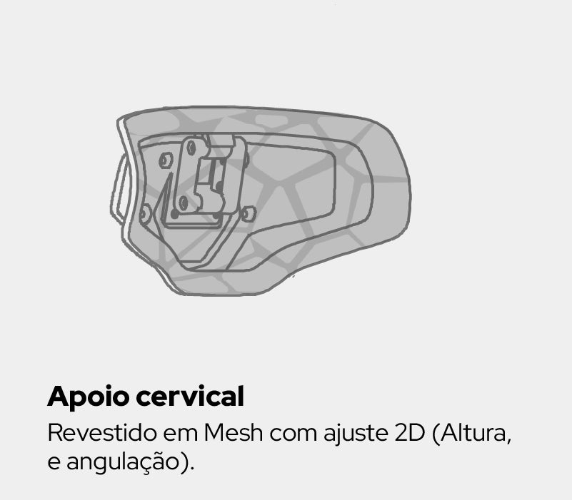 Ajustes Essenciais: Inclui ajuste de Altura e Profundidade do Assento, Apoio Lombar ajustável em altura e Apoio de Cabeça com regulagem de altura e ângulo.