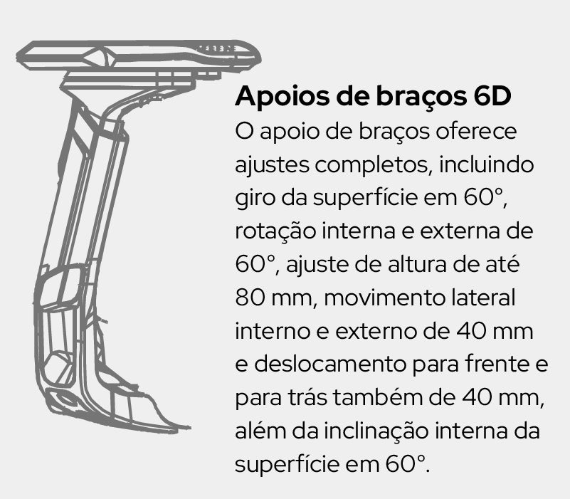 Braços (Inovação): Este é o seu grande diferencial. Controle os apoios de braço em seis dimensões diferentes, permitindo que você personalize o suporte exato para digitação, controle ou descanso, aliviando o estresse dos ombros.