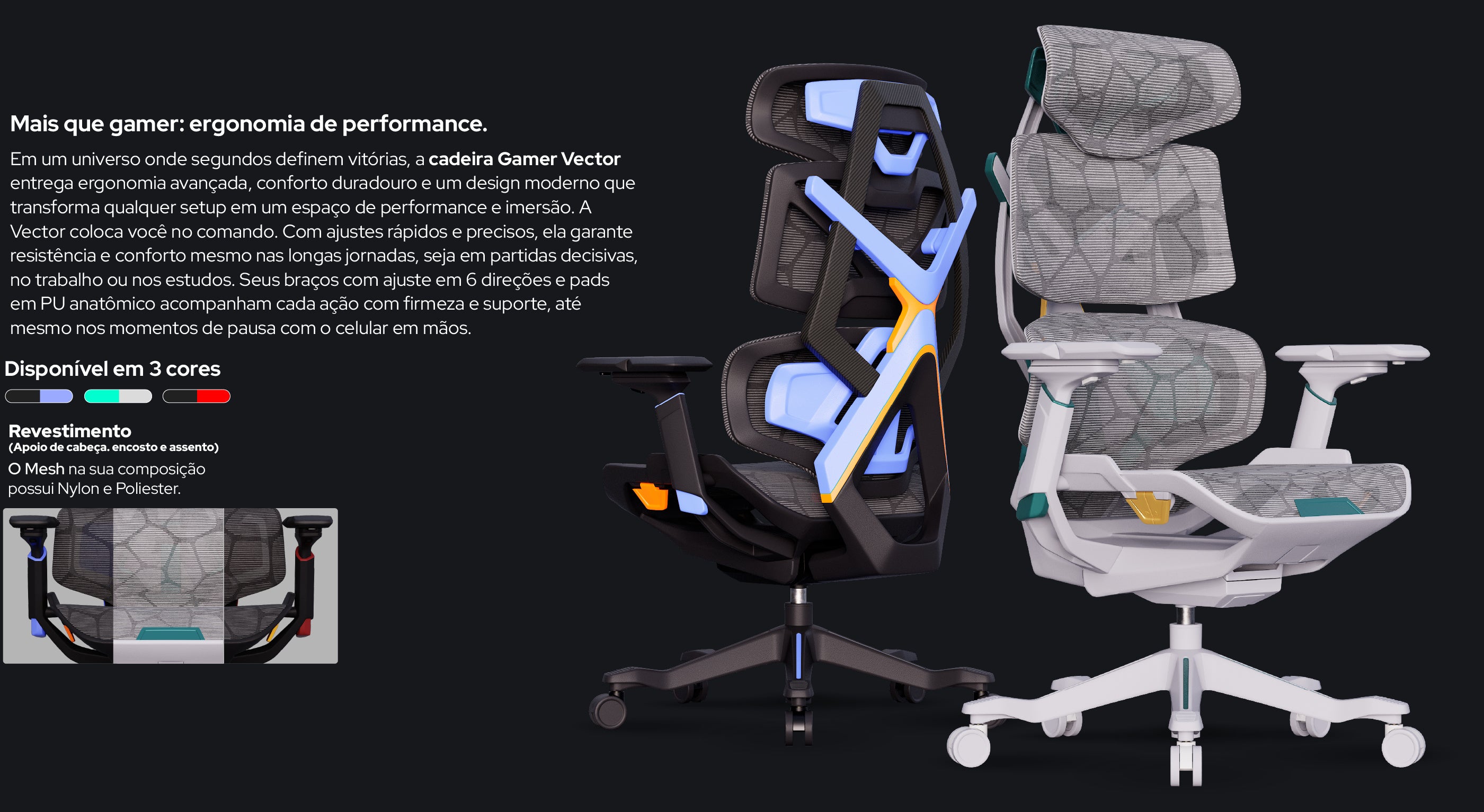 Apresentamos o lançamento que une design arrojado e ergonomia de precisão: a Cadeira Ergonômica e Gamer Vector. Projetada para , programadores e profissionais que exigem controle total, a Vector é a única com Braços e uma Garantia Estendida de 4 em todos os componentes estruturais.