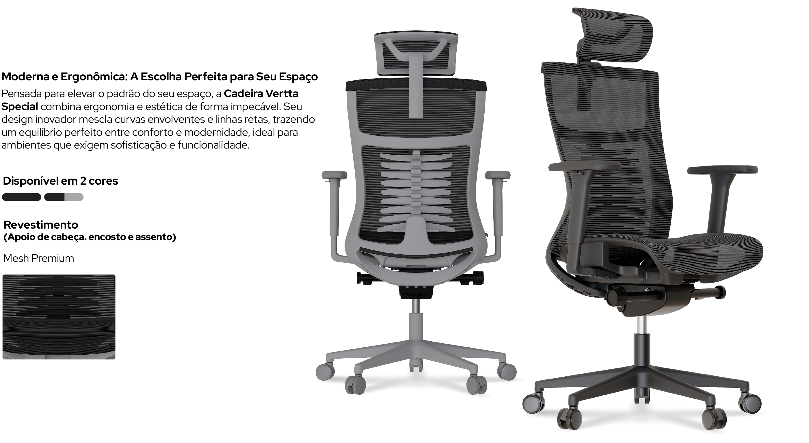 A cadeira ergonômica Vertta Special possui certificação BIFMA e atende aos requisitos da NR-17. Essas certificações asseguram que a cadeira foi projetada para proporcionar suporte adequado, prevenindo desconfortos e lesões relacionadas à postura inadequada.