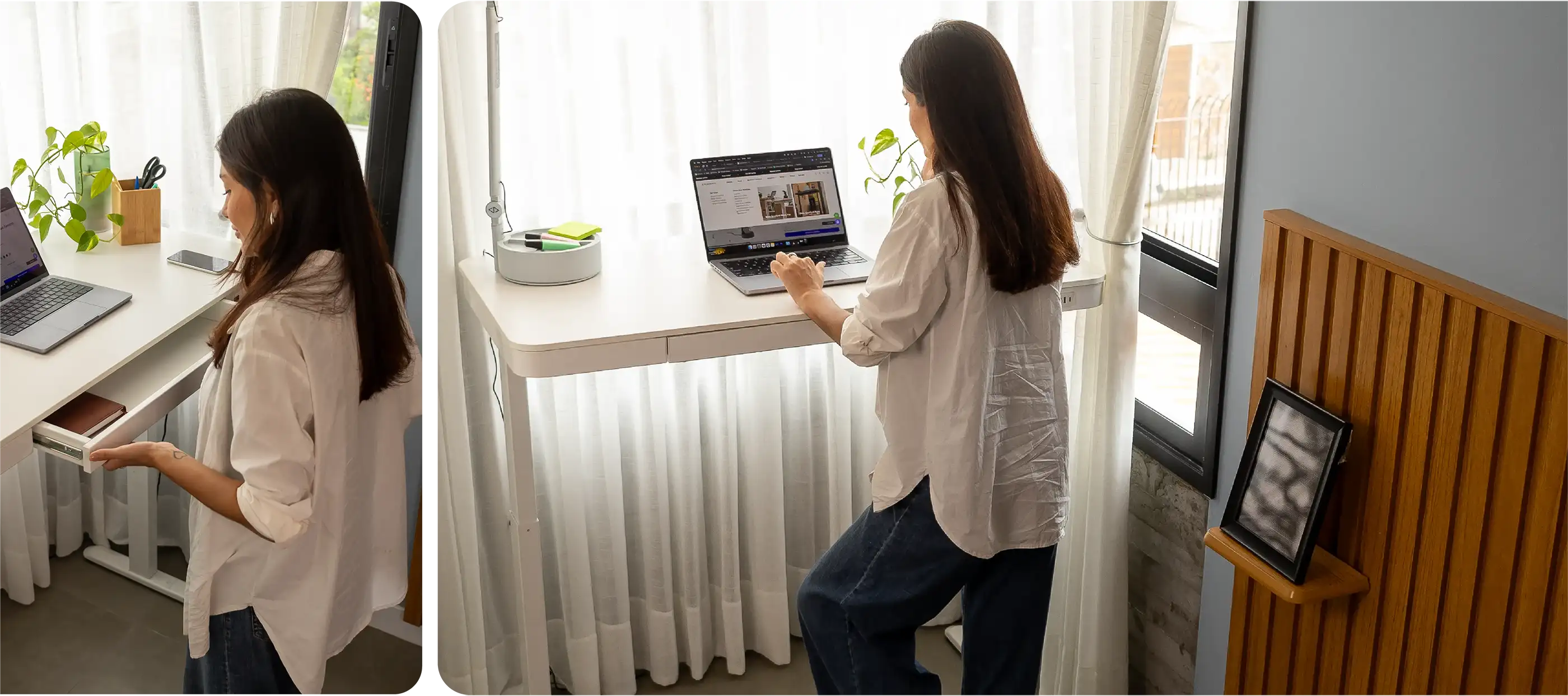 Alternar entre trabalhar sentado e em pé não é apenas uma opção, é uma vantagem. Essa versatilidade não só aumenta sua energia e criatividade, como também melhora a produtividade.