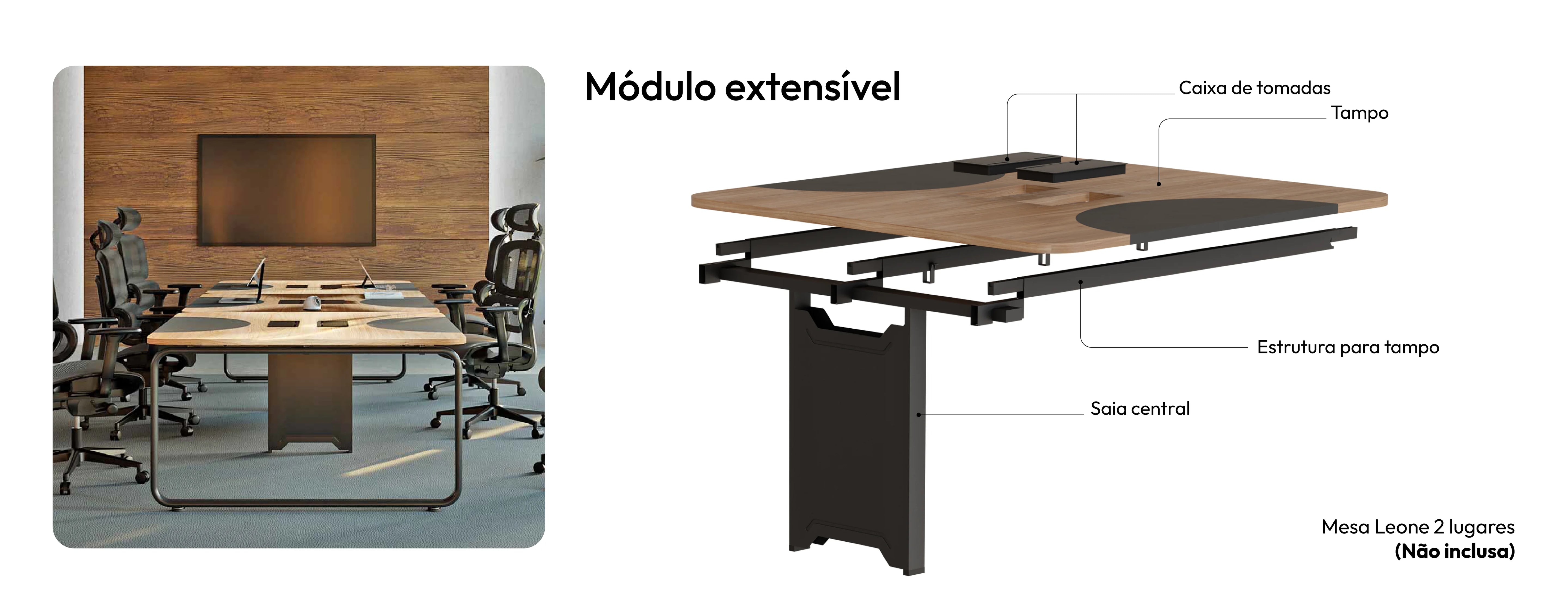 A mesa estação de trabalho Leone, módulo extensivo, é a solução ideal para ambientes de trabalho que exigem flexibilidade e espaço adicional. Projetada para acomodar de 4 a 6 ou mais lugares, sua estrutura modular adapta-se facilmente às crescentes necessidades de colaboração e produtividade, proporcionando funcionalidade e versatilidade ao espaço.