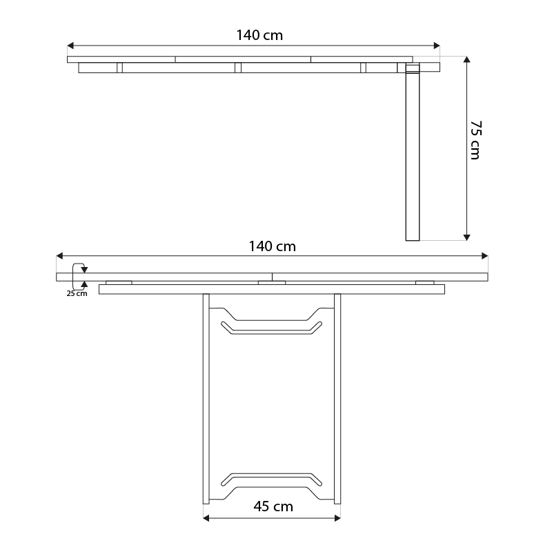 Estrutura: 45,5 x 6 x 69 cm Hastes Transversais: 111,3 x 7,5 x 5 cm Tampo: 147 x 76 x 4 cm