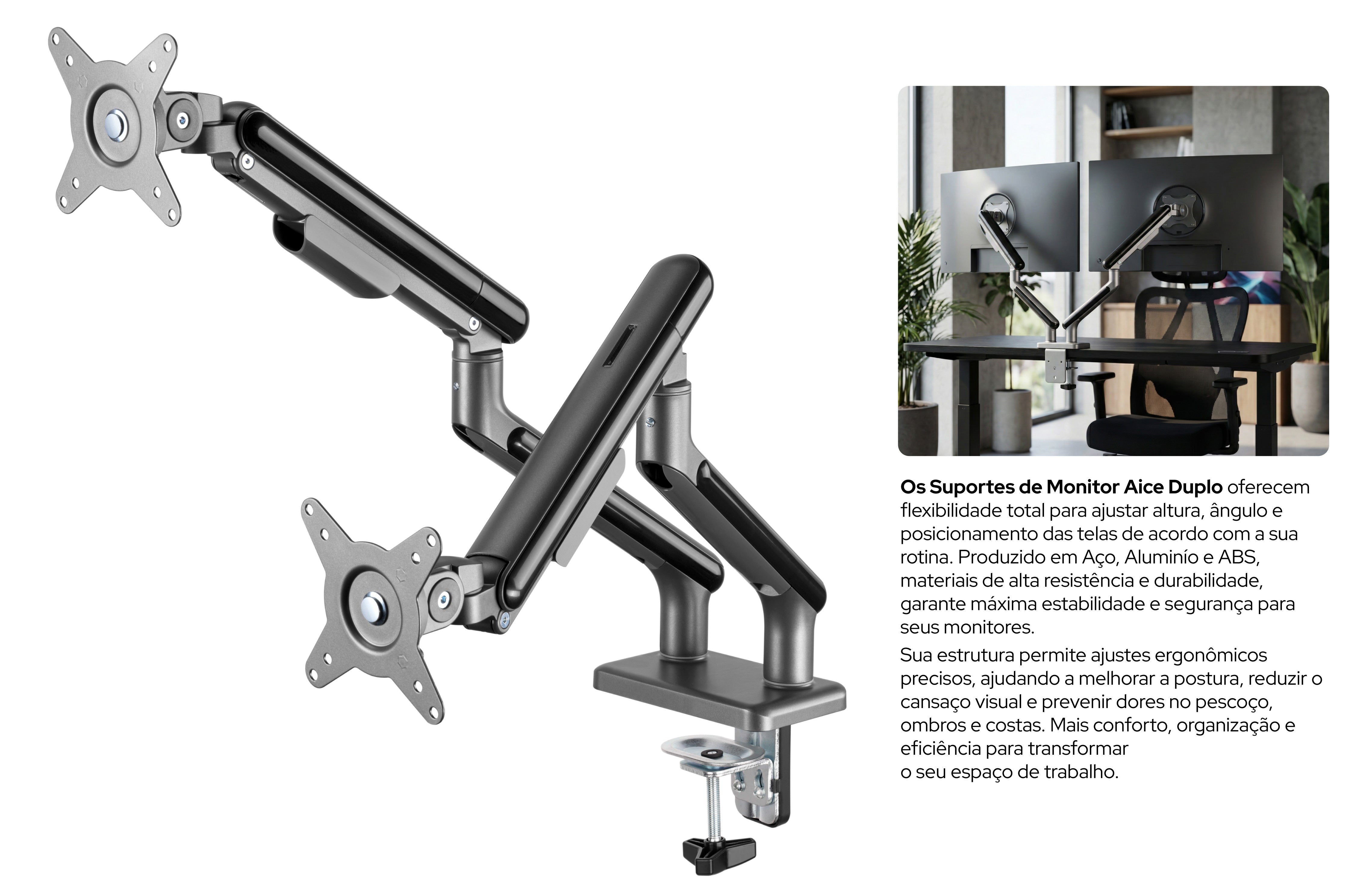 Eleve seu setup para o próximo nível com a linha de suportes articulados Elements Aice. Projetados para oferecer o máximo de flexibilidade, Aice Duplo é a escolha ideal para profissionais e gamers que buscam otimizar o espaço da mesa e garantir a postura correta durante horas de uso.